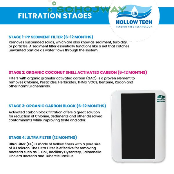 The Hollow Tech water purifier System is an ultrafiltration powerhouse, offering an effective solution for water purification. It is versatile enough to treat various water sources, including municipal water, well water, and even lake water.
